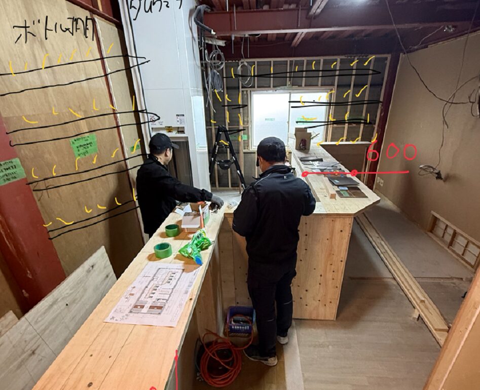 狭小店舗ですのでミリ単位で毎日現場で全ての配置を確認・修正しています。