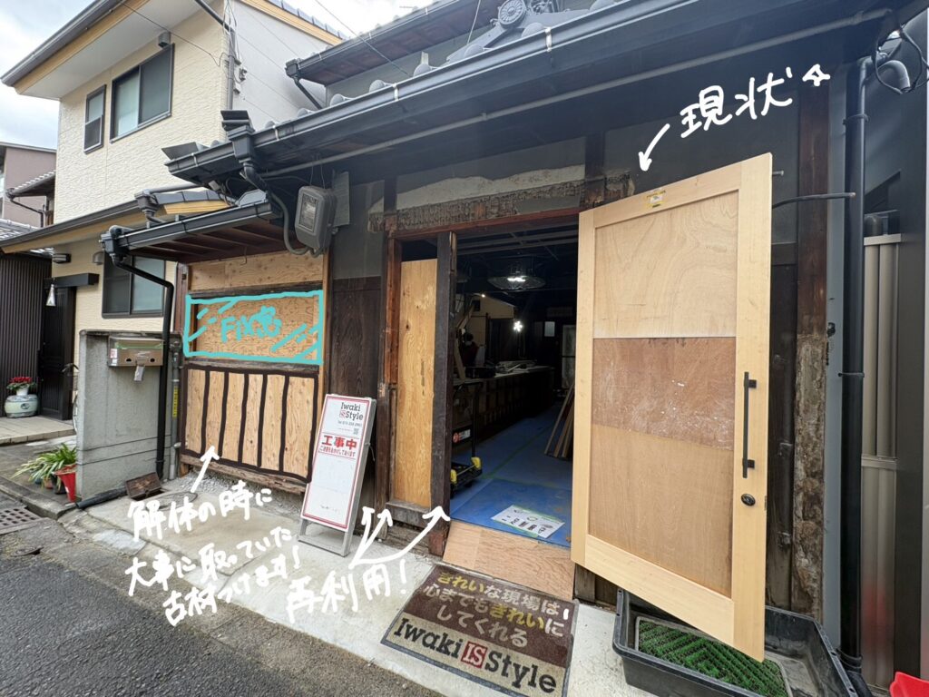 解体の時にとっておいた古材を上手く使い、入口の形ができています!