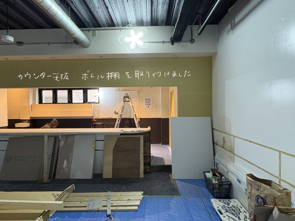 そして今日の大工工事ではカウンター天板とボトル棚を取り付けました。