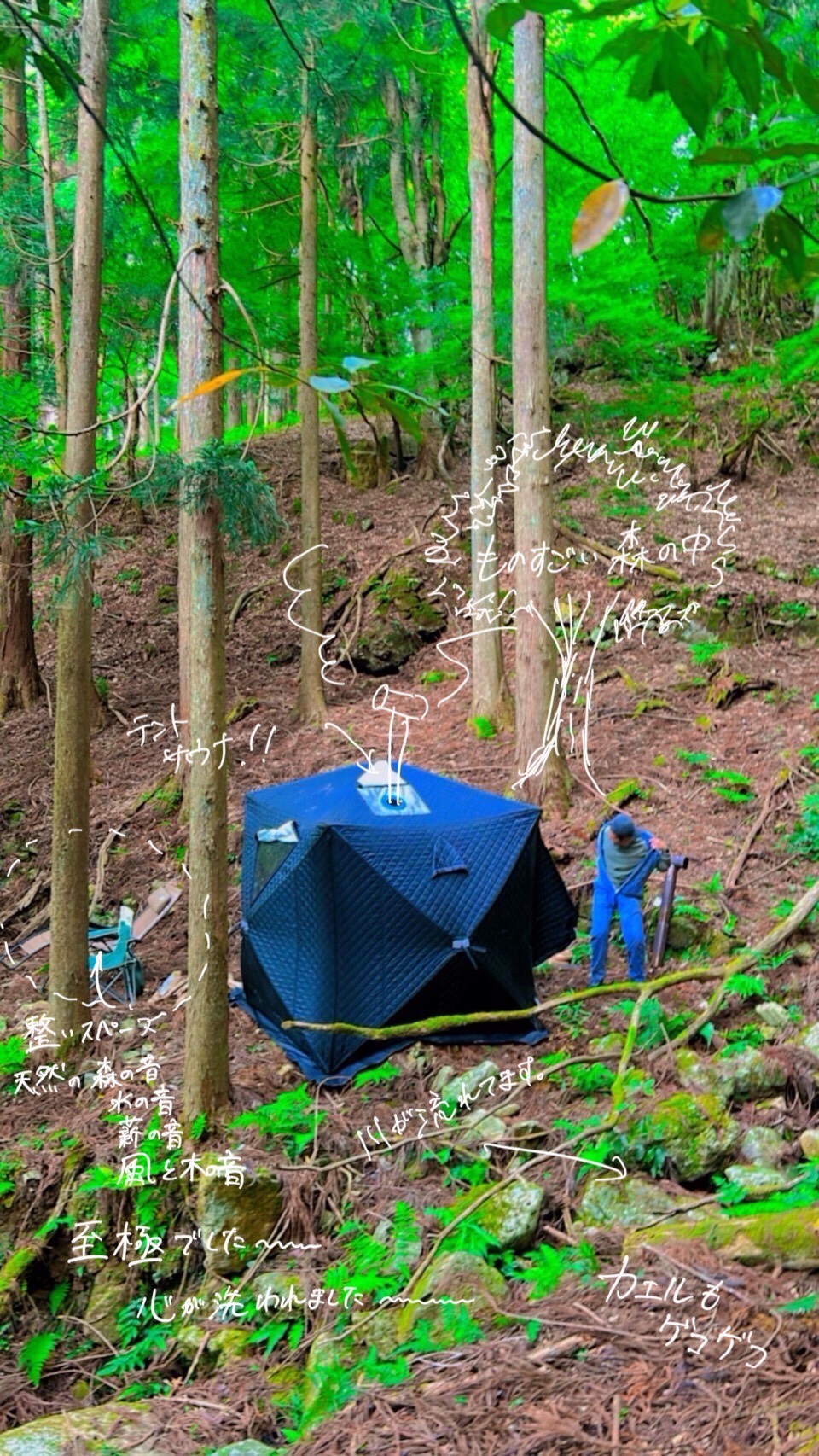 森の中にテントサウナを立てて、薪ストーブで温まり、じっくり汗をかいた後は、